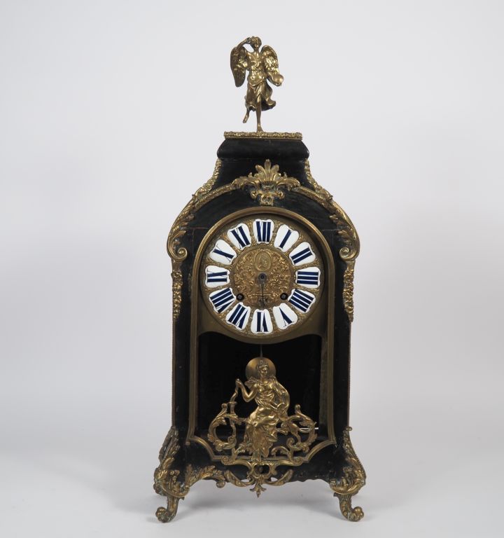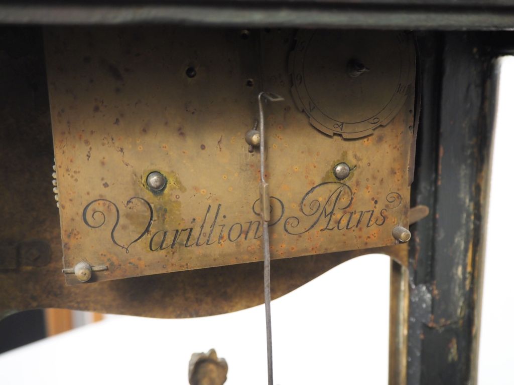 Cartel de style Louis XV en bois noirci et bronze à décor de renommée ailée et de figures allégoriques entourées de feuillage. Les chiffres du cadran émaillés. Mouvement signé sur la platine VARILLON à Paris Dim. 84 x 26 x 15 cm. (manques)