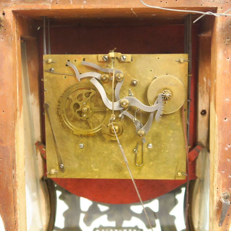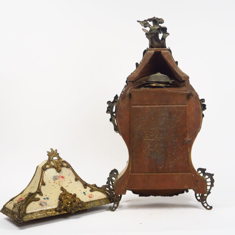 Cartel Louis XV en bois laqué à décor de fleurs polychromes sur fond blanc, bel entourage de laiton repoussé. H. 70 cm
