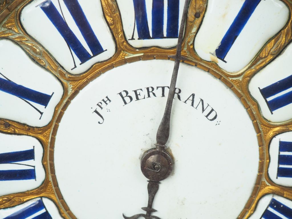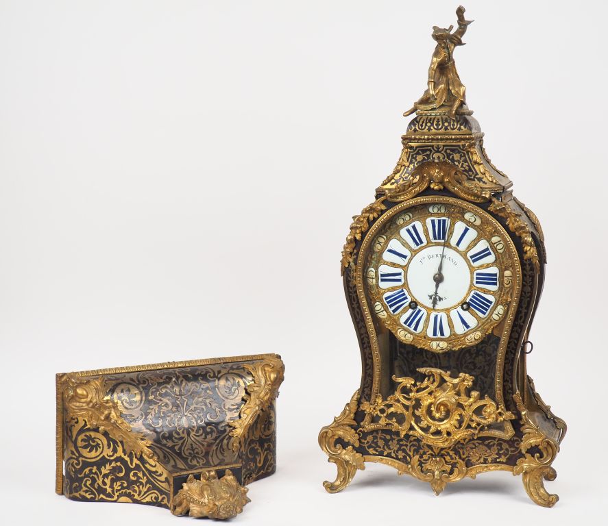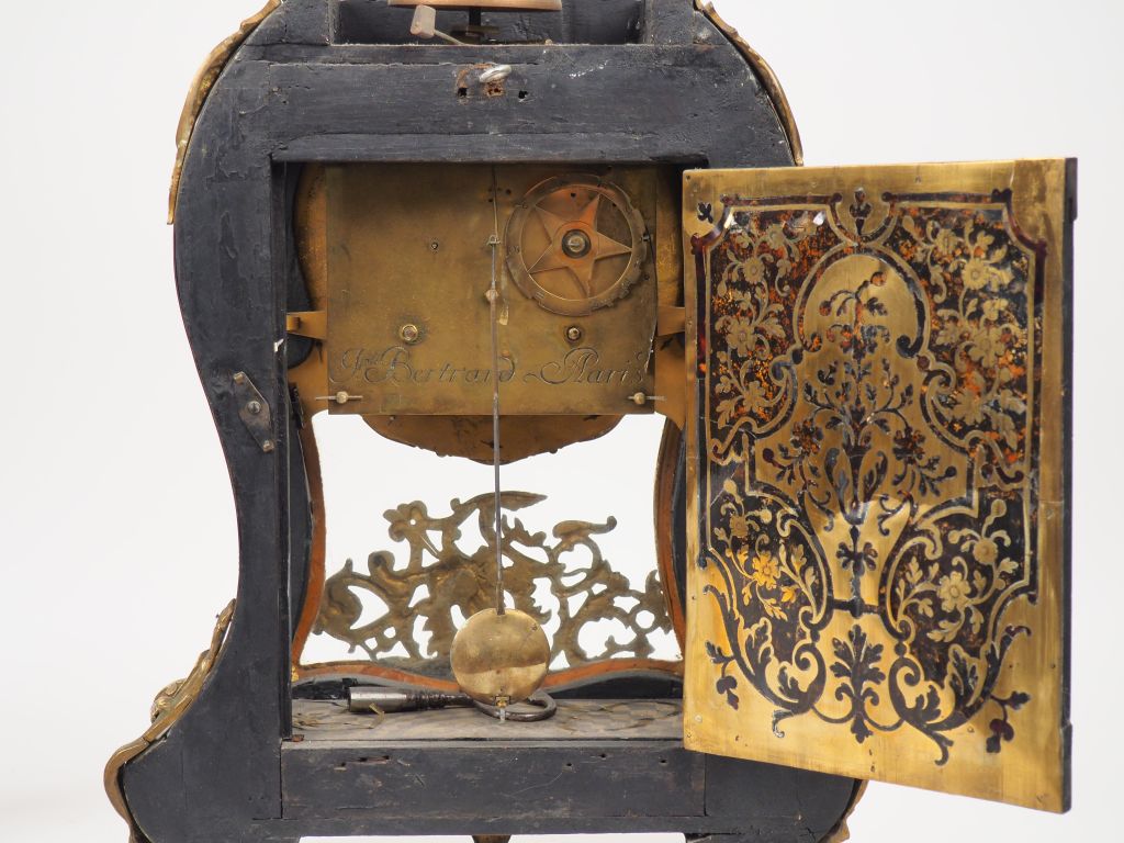 Cartel Napoléon III de style Louis XV en marqueterie Boulle, avec son support, cadran signé Joseph Bertrand à Paris, en partie émaillé, chiffres des minutes. (restauré).