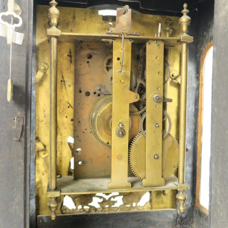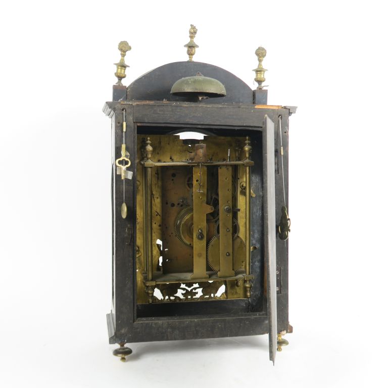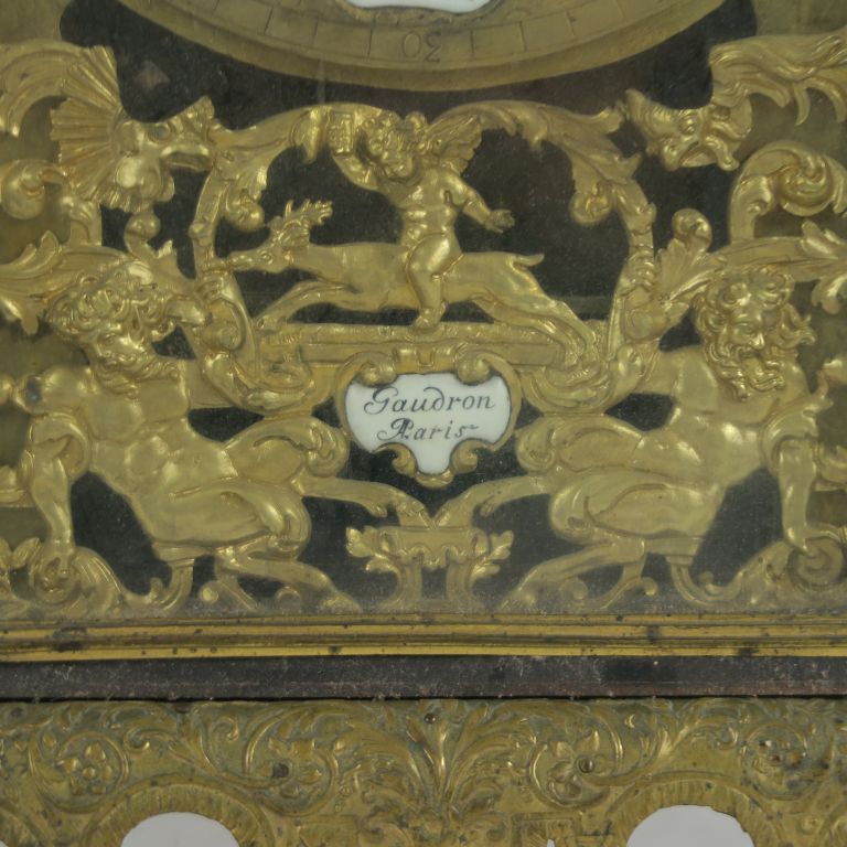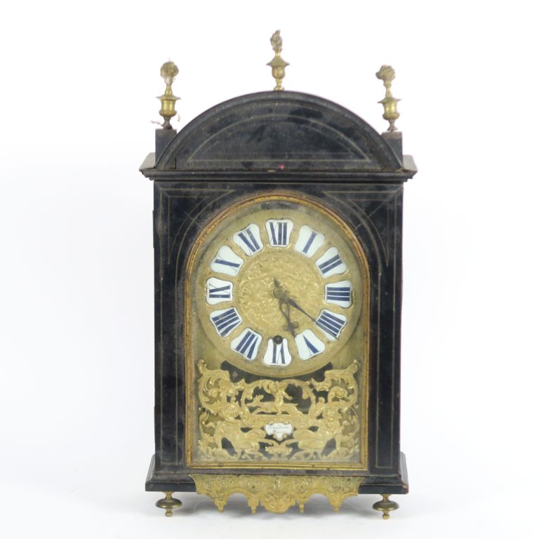 Cartel Régence en placage d'ébène fileté de laiton et bronze, cadran en bronze et émail signé Gaudron à Paris (manques et accidents) Dim. 61,5 x 33 x 15 cm
