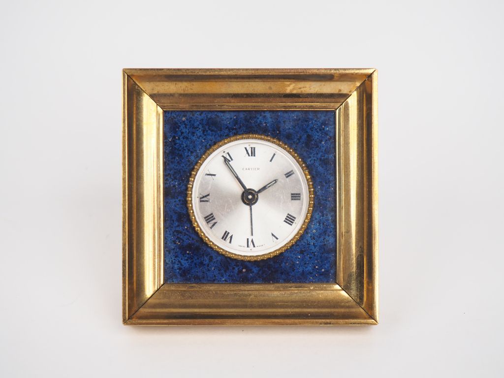 CARTIER. Réveil en laiton et Lapis-lazuli à décor d'une frise de perles. Signé. Dim. 7,5 x 7,5 cm.