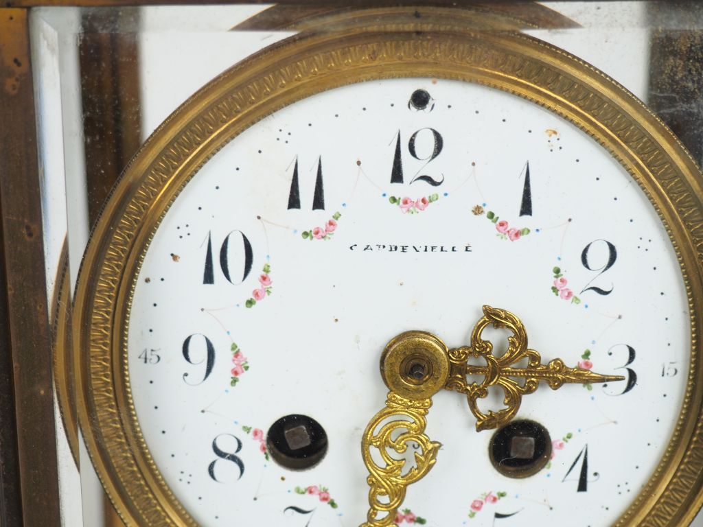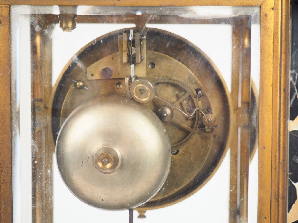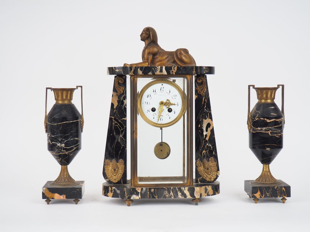 Garniture de cheminée Art Déco de style égyptien en marbre portor et bronze comprenant : - une pendule cage - une paire d'urnes Dim. de la pendule : 42 x 30 cm H. urne : 28 cm (une anse à revisser)
