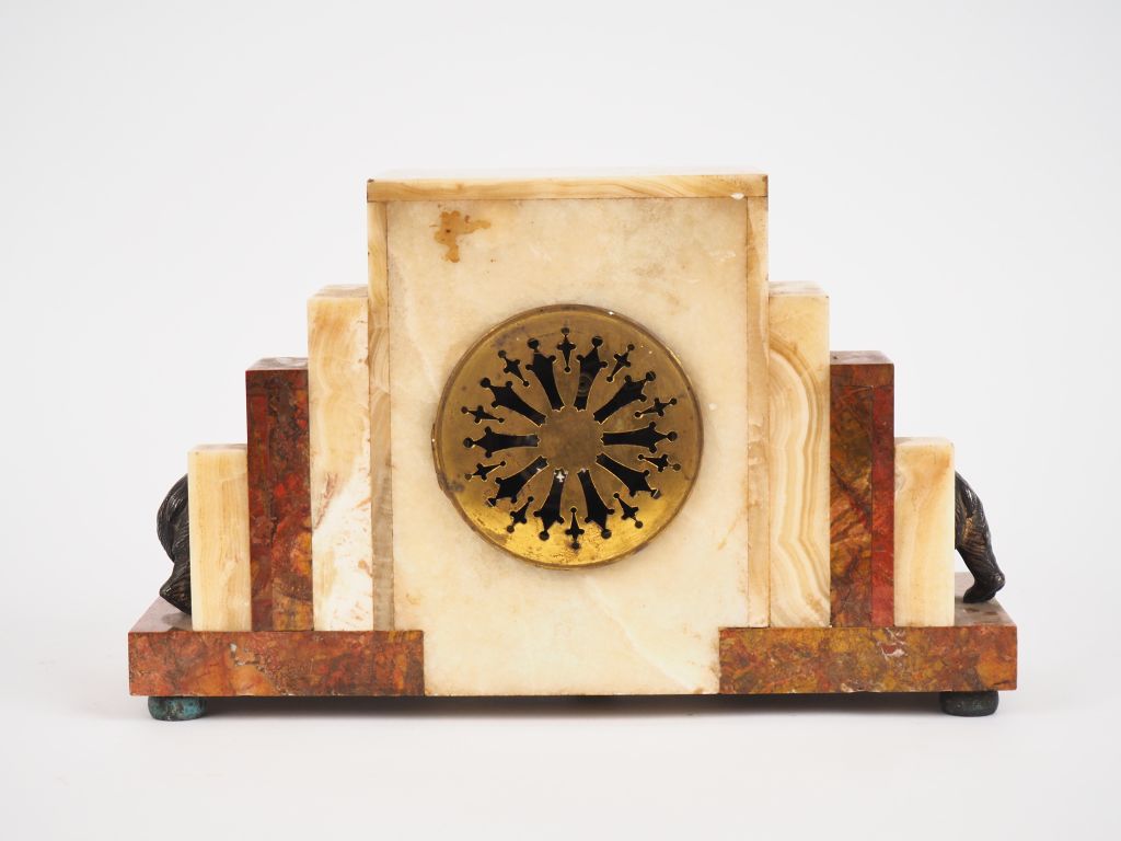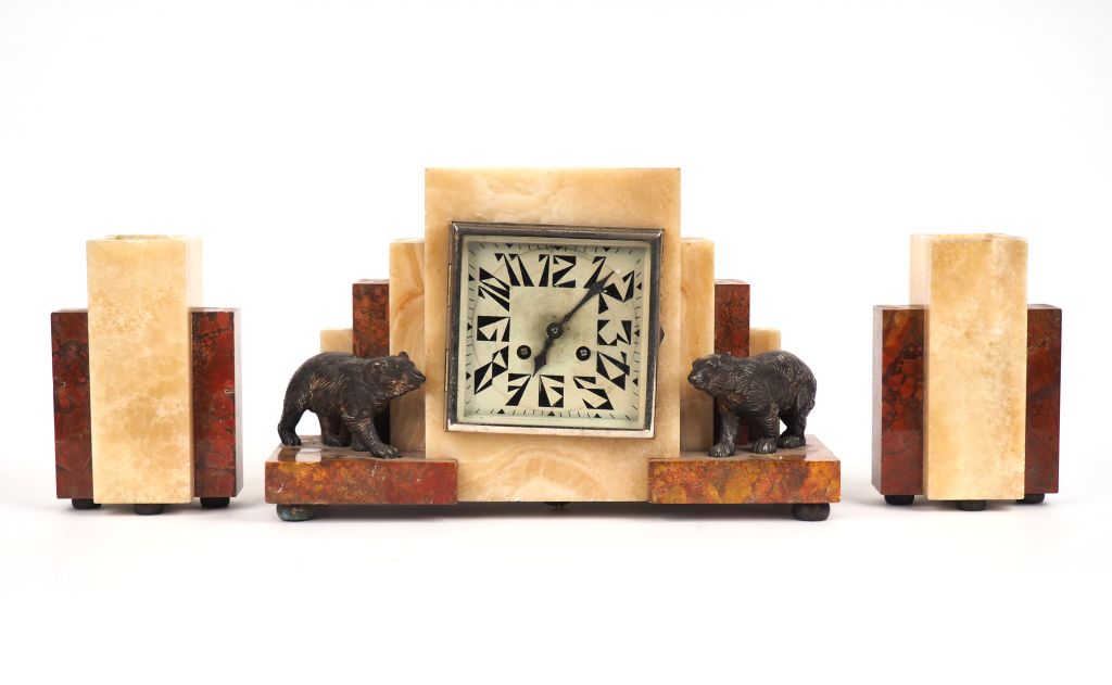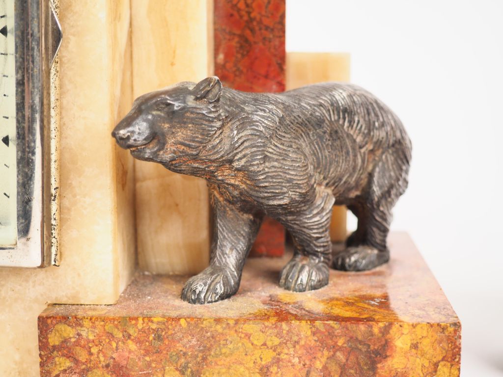 Garniture de cheminée Art Déco en marbre rose et albâtre, à décor de deux ours polaires en régule argenté.