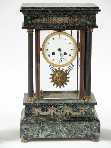 Garniture de cheminée de style Louis XVI en marbre vert, bronze et laiton, comprenant une pendule portique cage et une paire de candélabres éclairant à 4 lumières (égrenure au marbre d'un des candélabre). H. des candélabres : 53,5 cm H. de la pendule : 44 cm