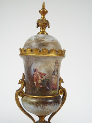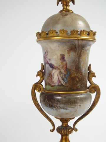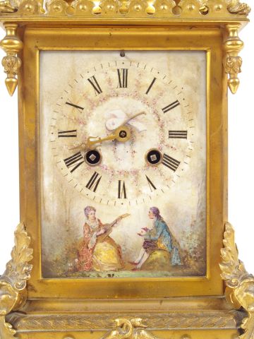 Garniture de cheminée Napoléon III de style Louis XIV en porcelaine polychrome et bronze doré, à décor de personnages dans un parc et de paysage comprenant : une pendule borne et une paire de cassolettes (fels à une cassolette, manque une aiguille) H. Pendule : 40 cm, H. cassolette : 30 cm