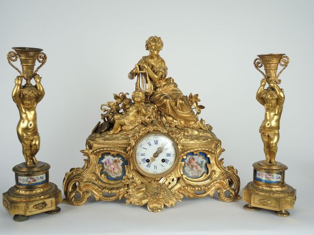 Garniture de cheminée Napoléon III de style Louis XVI en bronze doré et plaques de porcelaine polychrome à décor d'allégorie de la musique et d'amours. H. 42 cm (une plaque accidentée)