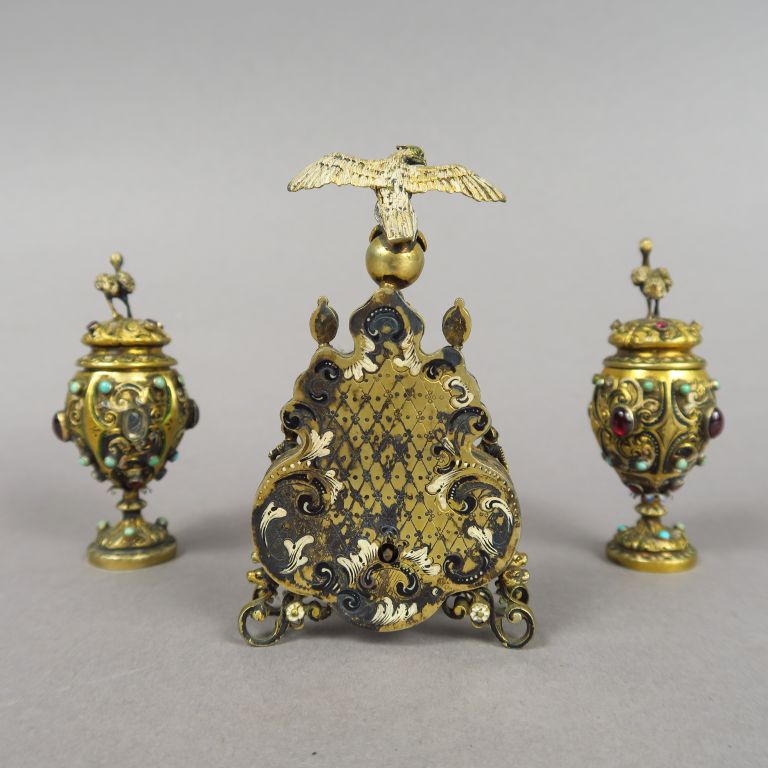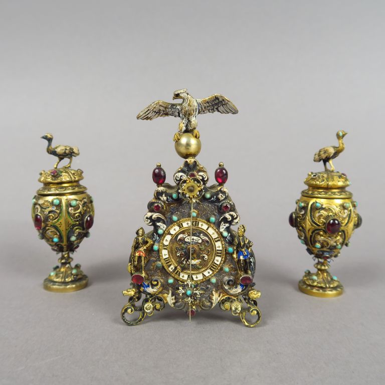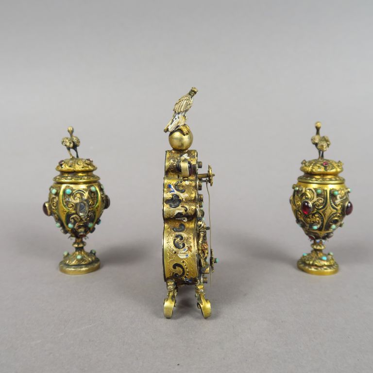 Garniture Napoléon III en vermeil de style Renaissance à décor d'oiseaux, de chevaliers, d'émaux, l'ensemble rehaussés de perles et de pierres rouges en cabochon comprenant une pendulette et une paire de pots couverts. H. : 10,5 cm et 8,5 cm.
