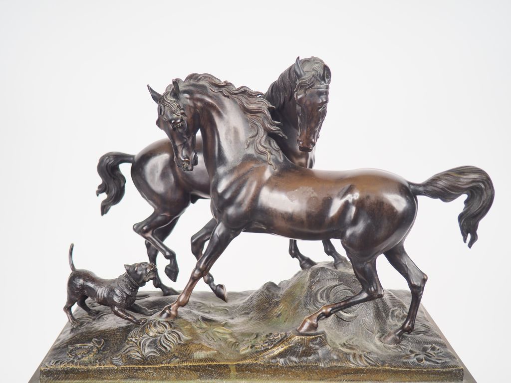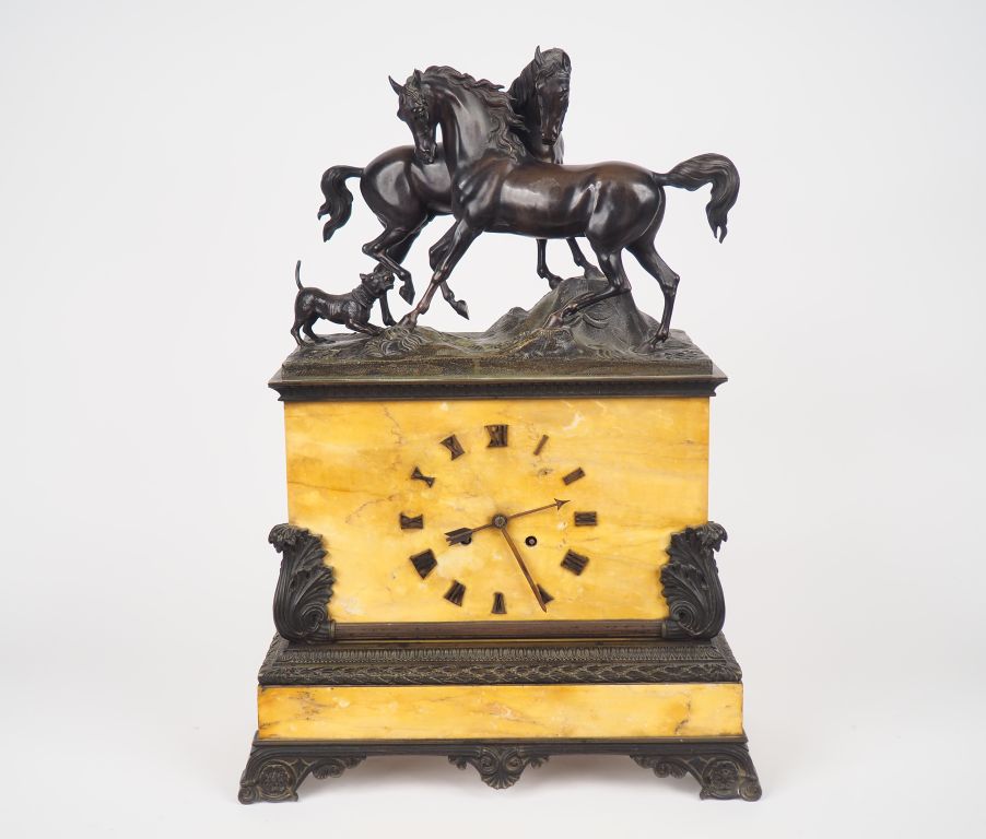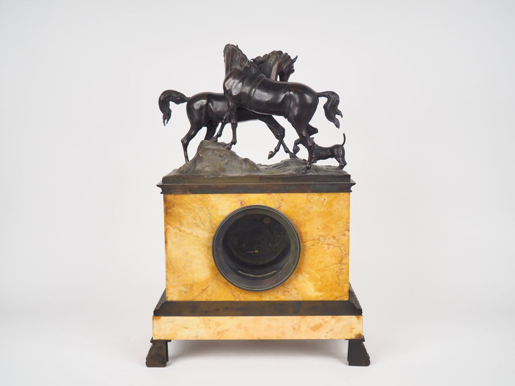 Grande pendule Restauration en marbre jaune de Sienne et bronze à patine brune, à décor de deux chevaux et d'un chien. Dim. 57 x 39,5 x 19 cm.