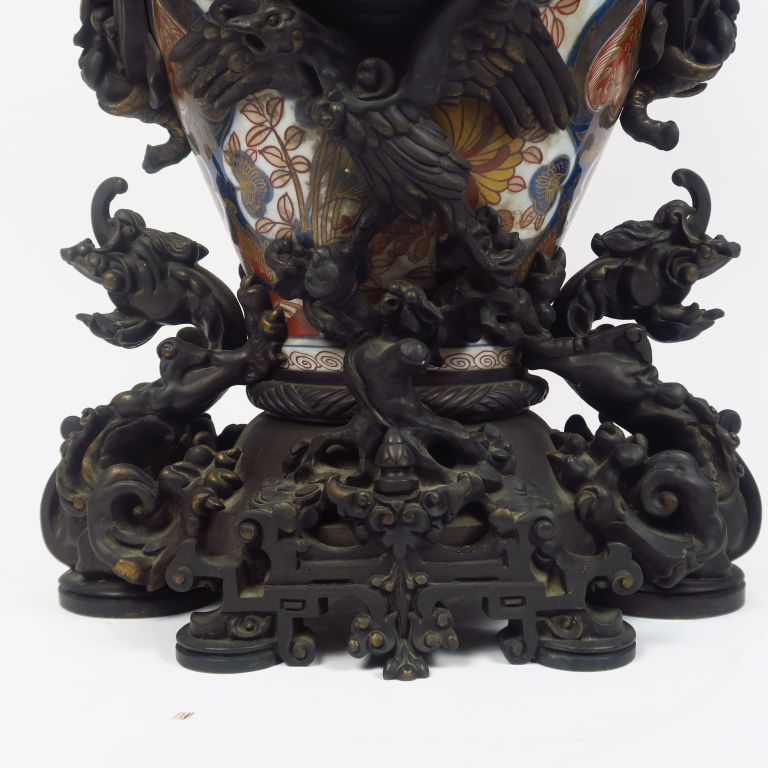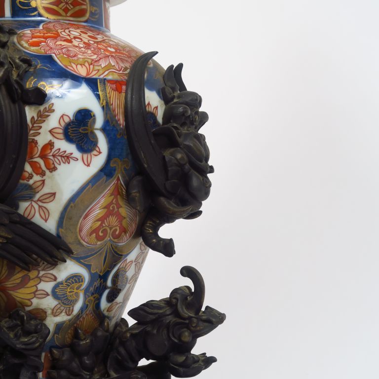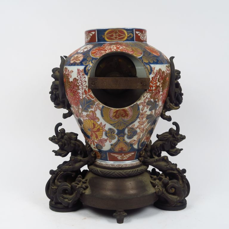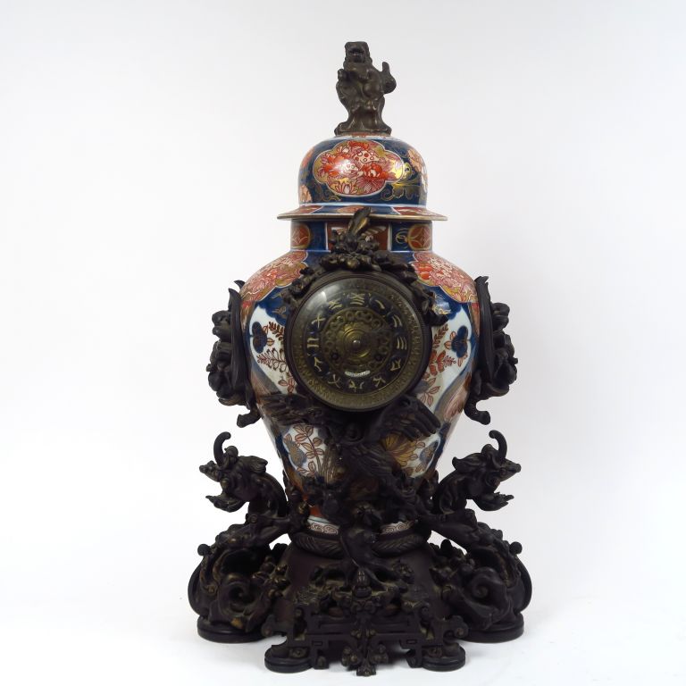 Grande pendule XIXème en porcelaine d'Imari, en forme de vase couvert, belle monture en bronze de style Extrême Orient, cadran signé H. Luppens à Bruxelles. H. 67 cm