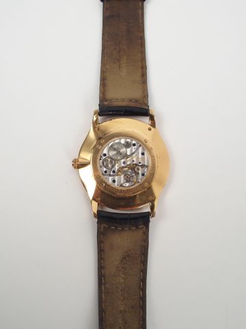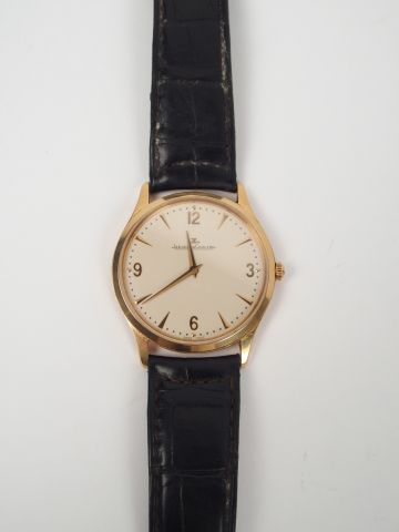 JAEGER LECOULTRE. Montre homme bracelet or jaune, modèle Ultra Thin or jaune, vers 2010. Cadran crème, boitier rond. Bracelet d'origine cuir noir. Numéro de série: 172.2.79.S
