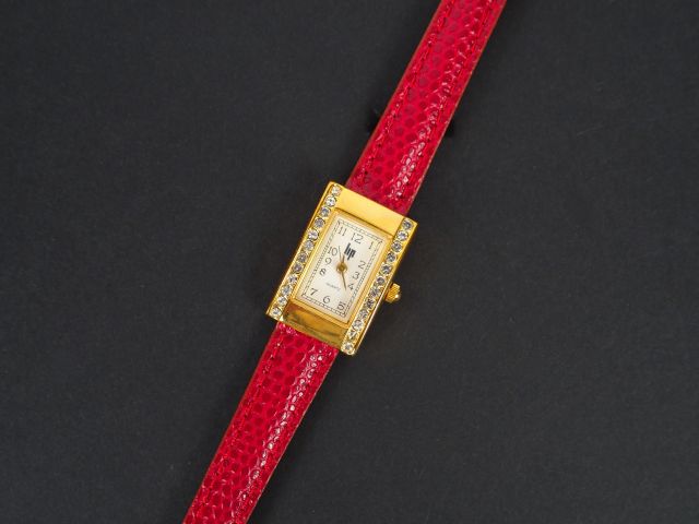 LIP. Montre de dame, boitier rectangulaire en métal doré et strass, bracelet cuir rouge.