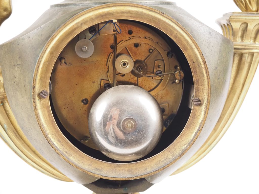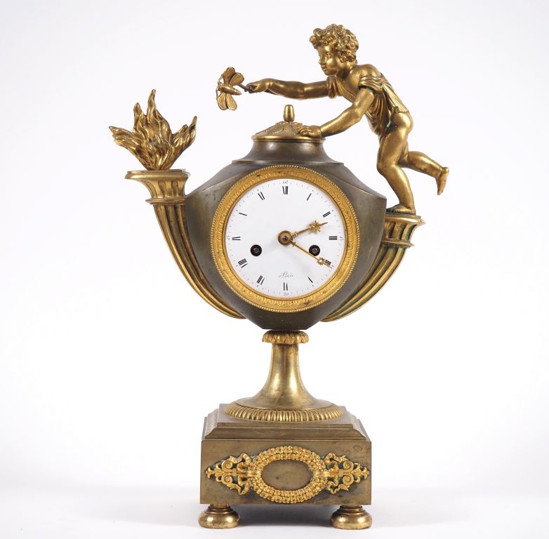 Pendule de style Empire en bronze, à double patine, figurant un amour au papillon sur une lampe, cadran émaillé (petit éclat, manque les verres) H. 35 cm
