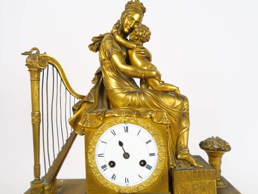 Pendule début XIXème en bronze doré « Maternité » H. 49.5 cm (manque au cadran)
