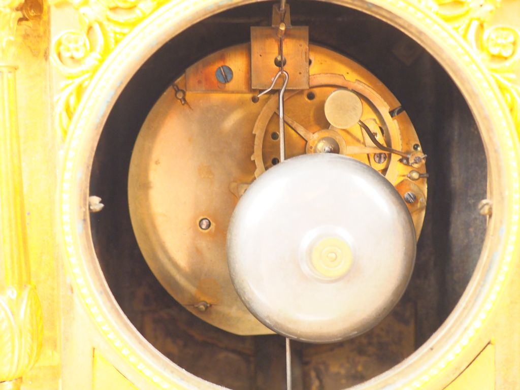 Pendule Empire en bronze doré, à décor de marchandes d’amours, de frises de palmettes et de pampres. Quatre colonnes balustres détachées. Signée LEROY. Dim. 35 x 23,5 x 14,5 cm