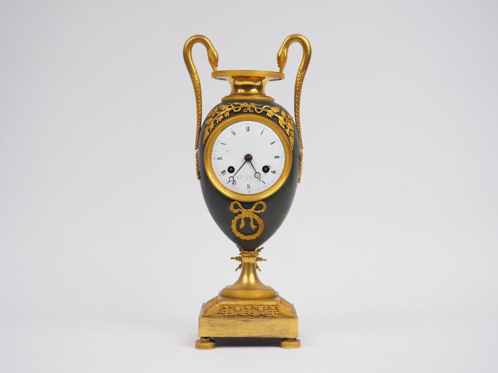 Pendule Empire en bronze patiné et doré, à décor de col de cygne. Cadran signé Joly à Paris. H. : 40,5 cm. (éclats)