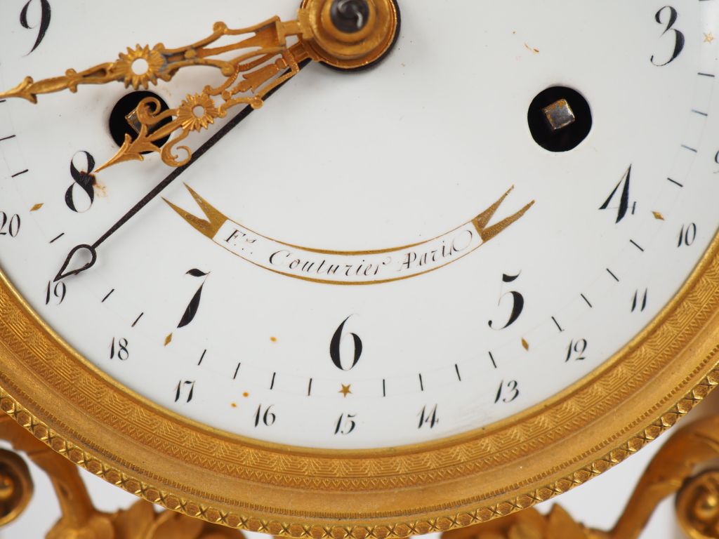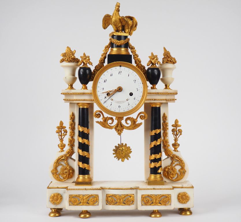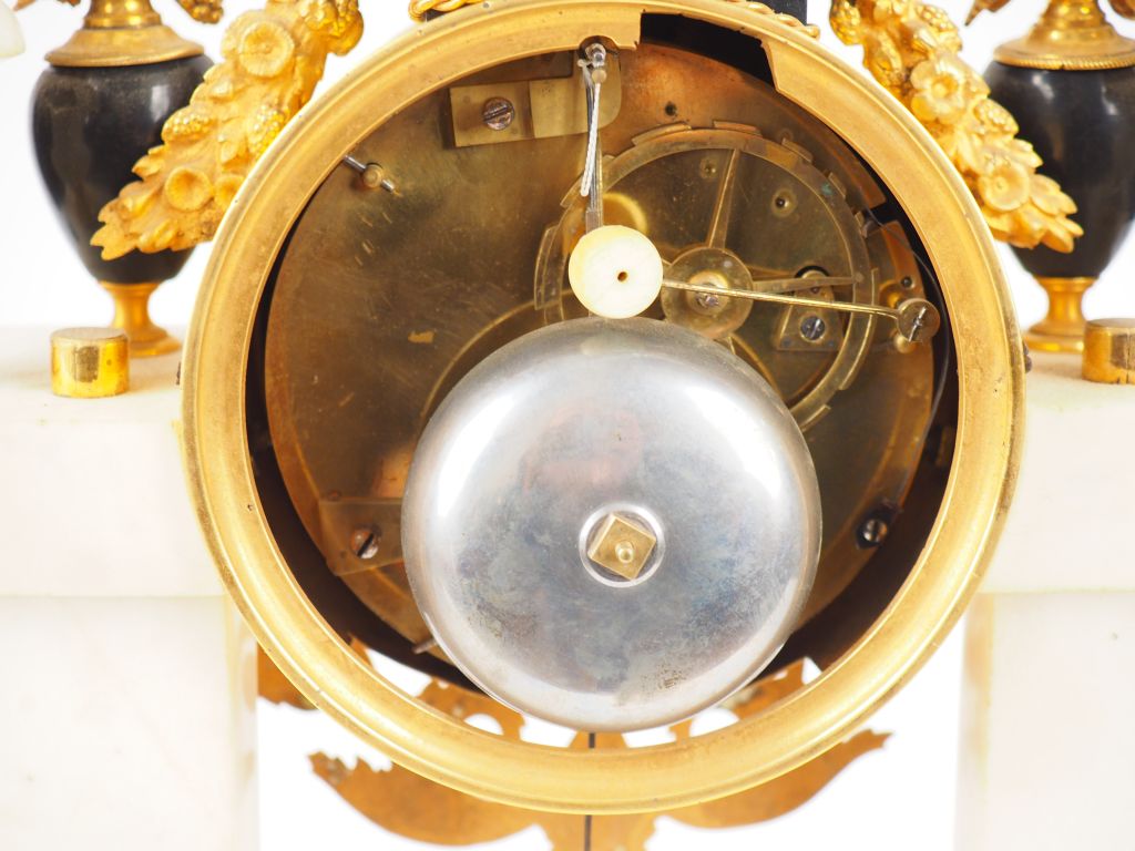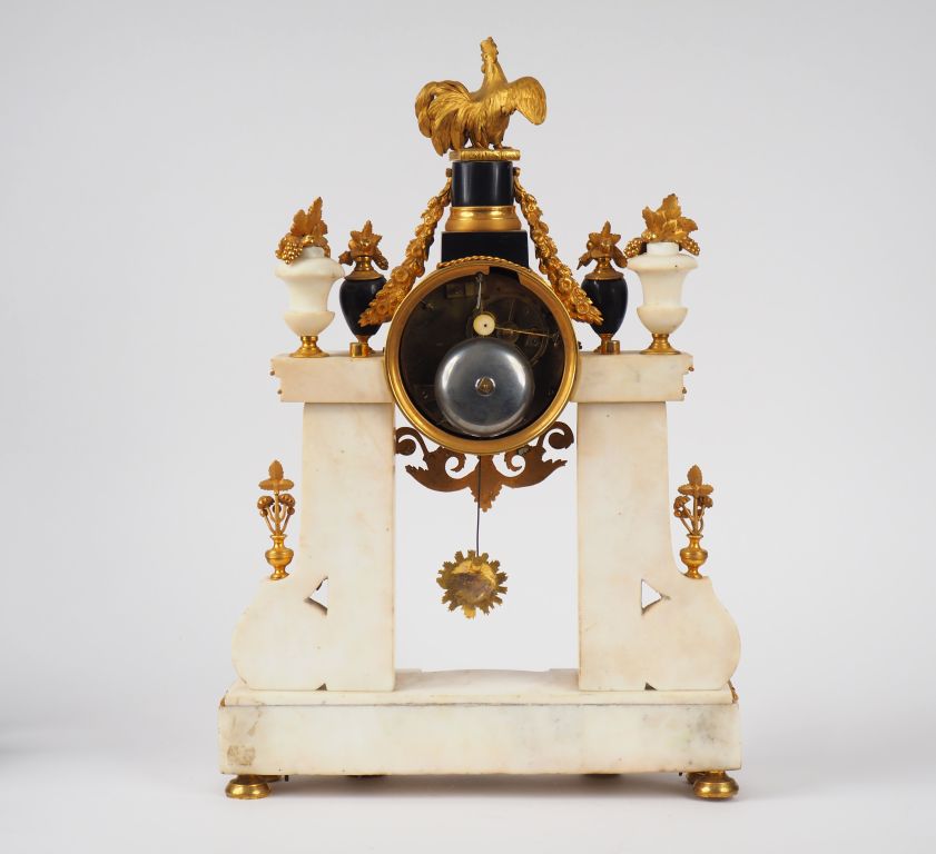 Pendule Empire en marbre bicolore blanc, noir et bronze doré à décor de vases fleuris, de coq et de rinceaux feuillagés, mouvement signé Couturier à Paris. Dim. 52 cm x 35 cm
