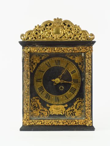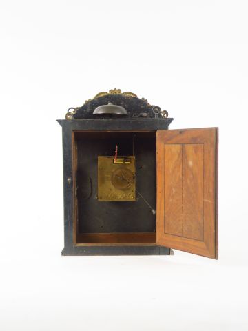 Pendule Louis XIV en bois noirci, laiton et bronze signée Balthazar Martinot à Paris (petits accidents) H. 41 cm