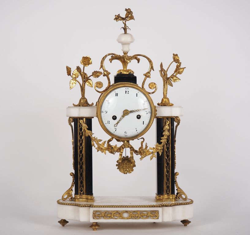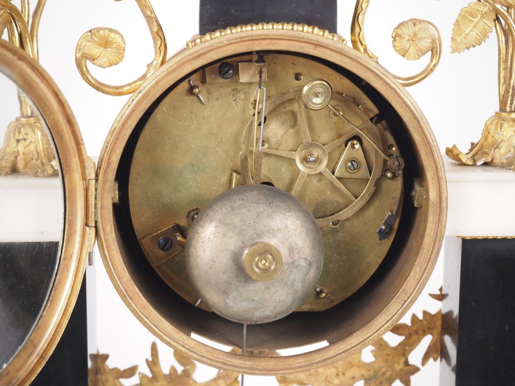 Pendule portique début XIXème de style Louis XVI en albatre et marbre noir, ornementation de bronze doré à décor de fleurs. H. 50,5 cm