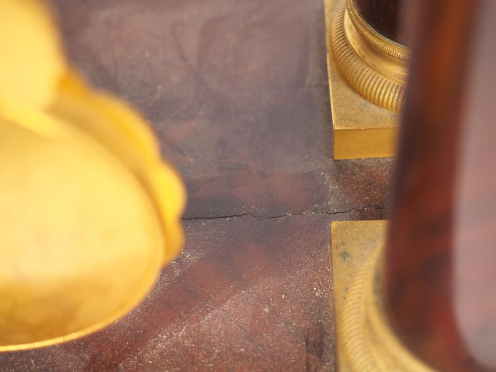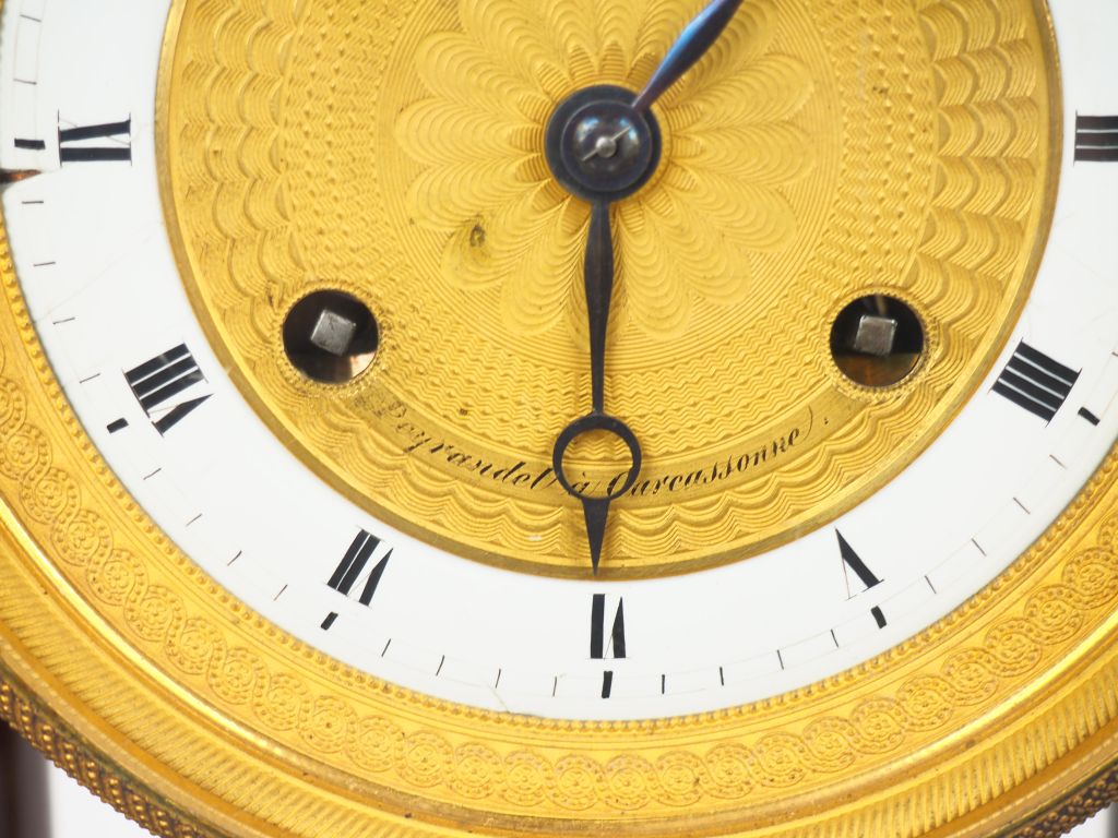 Pendule portique Empire en acajou et bronze doré, (petits accidents à l'émail du cadran). Dim. 50 x 26 x 15 cm