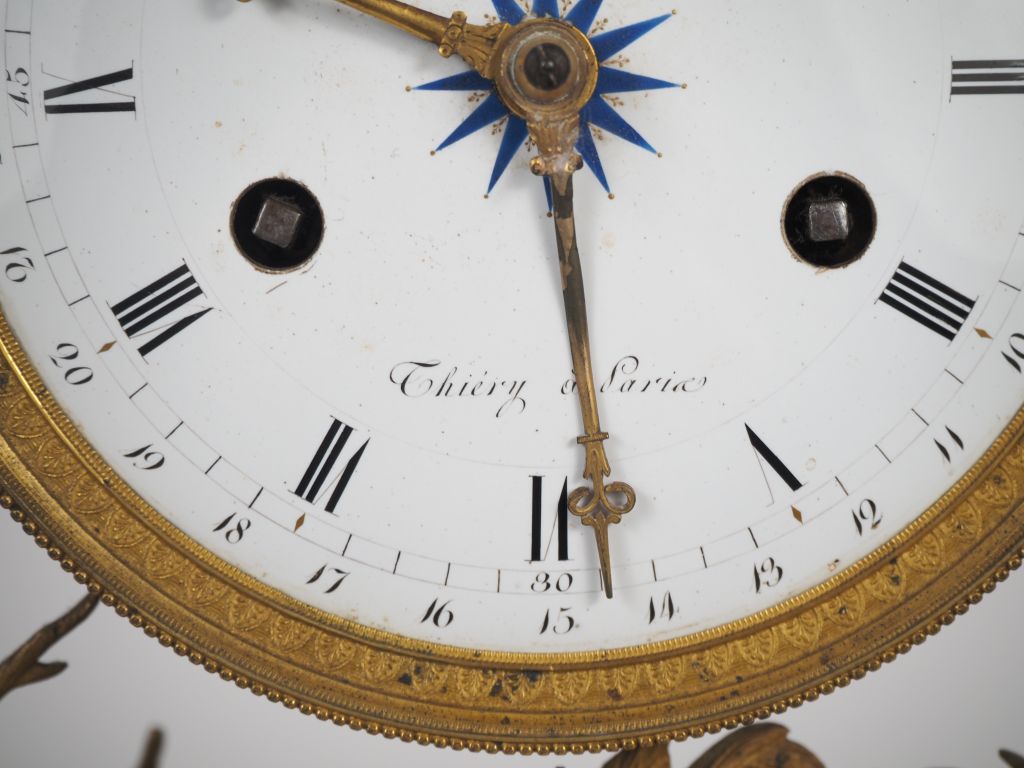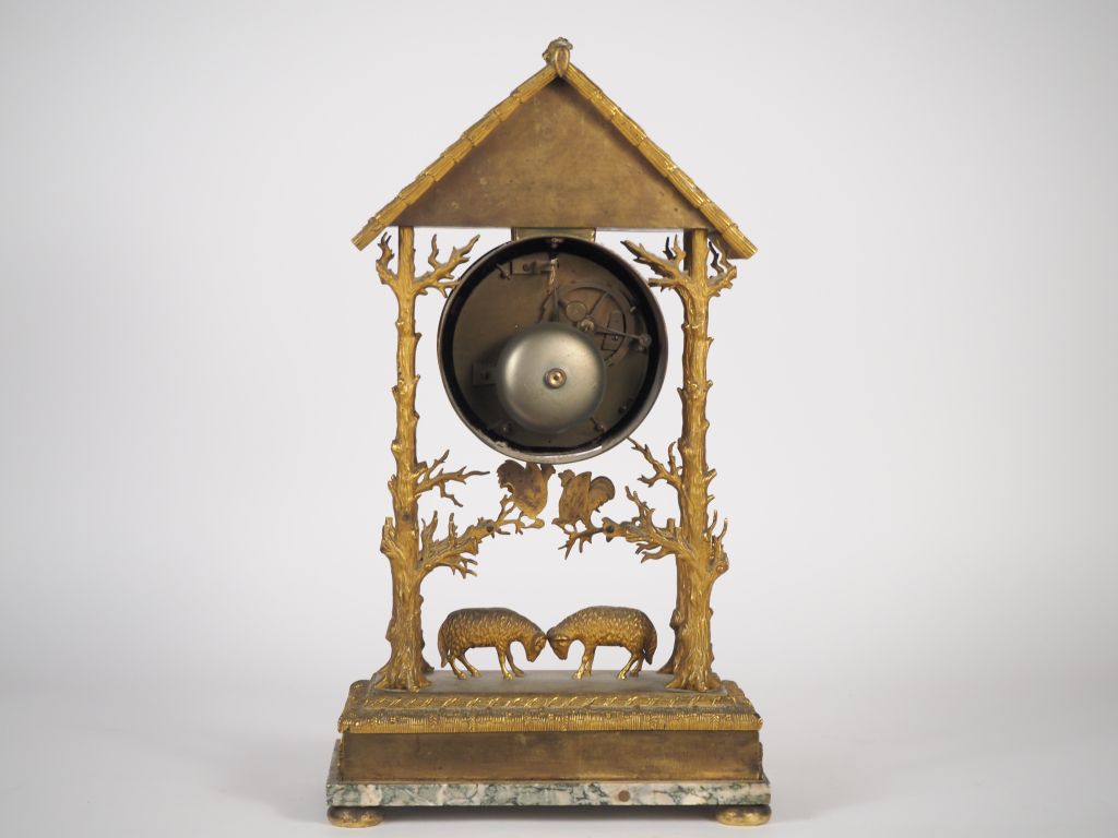 Pendule portique Restauration en bronze ciselé et doré doré figurant une bergerie au toit de chaume. Partie supérieure ornée d'un dindon en relief flanqué de deux chêvres. Montants simulant des troncs d'arbres agrémentés de coqs perchés, terrasse ornée de deux bêliers affrontés, la base à décor de lapins. Cadran émaillé à chiffres romains pour les heures et arabes pour les minutes, orné en son centre d'une étoile bleu nuit, signé THIERY à Paris. Dim. 50 x 29 x 15 cm. (Manque le balancier, verre manquant).