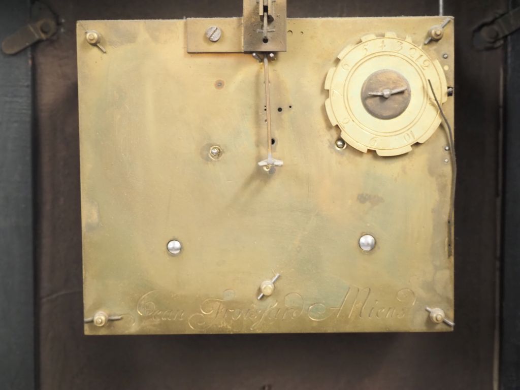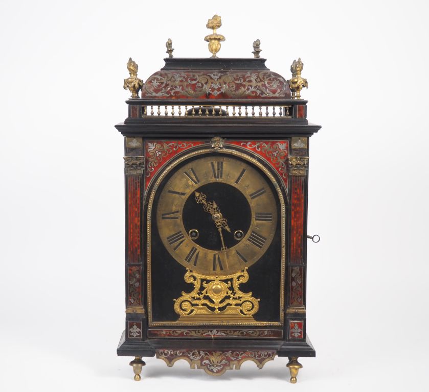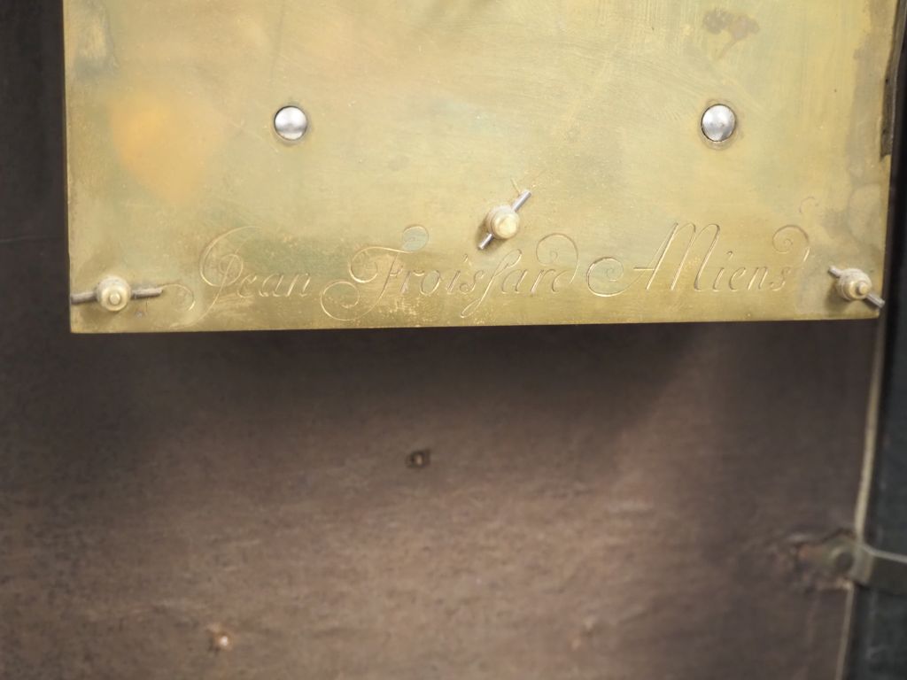 Pendule religieuse de style Louis XIV en marqueterie Boulle à décor de pilastres et de pot à feu, ornementation de bronze doré. Signée Jean Froissard à Amiens dans un cartouche et sur la platine. Dim. 65 x 33,5 x 14 cm. (Petits accidents, restauration)