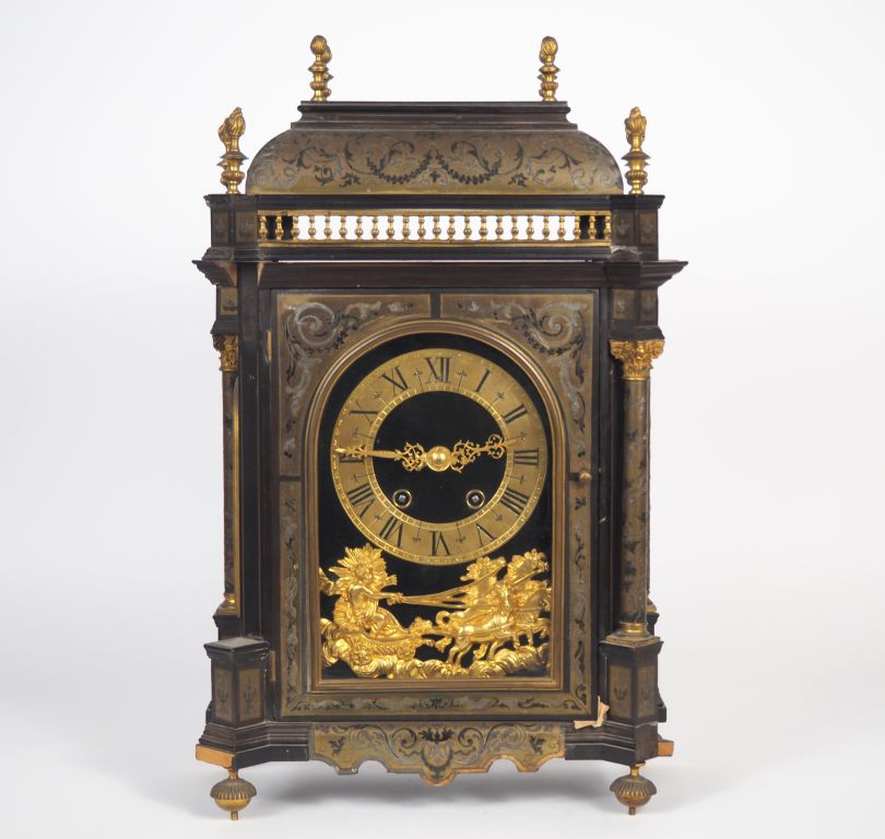 Pendule religieuse Napoléon III de style Louis XIV en marqueterie Boulle et laiton, à décor de pot à feu et figurant Poséidon sur son char. Dim. 56 x 34 x 17 cm. (Restaurations, manques).