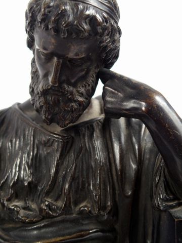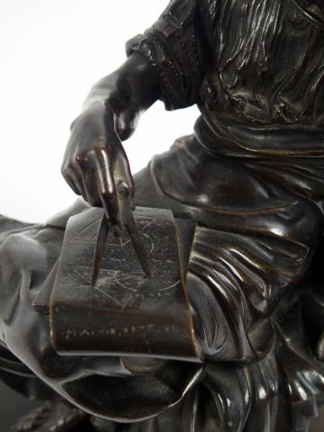 Pendule XIXème en marbre noir et bronze, à patine brune figurant une allégorie de la géométrie. H. 57 cm.