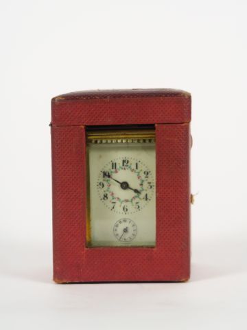Pendulette de voyage fin XIXème dans son étui en cuir rouge avec sa clé H. 12,5 cm