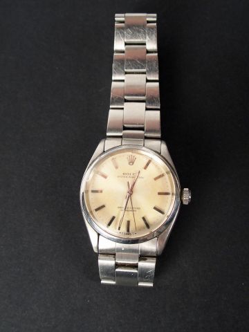ROLEX (Vers 1960). Montre d’homme en acier Oyster Perpetual. Boitier rond numéroté 571. Bracelet acier boucle déployante numéroté 78350. Quelques rayures au cadran