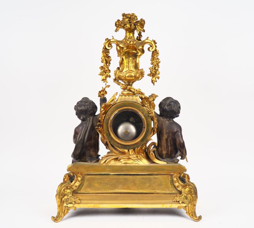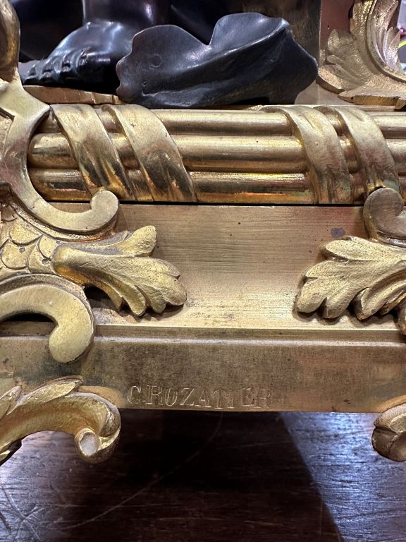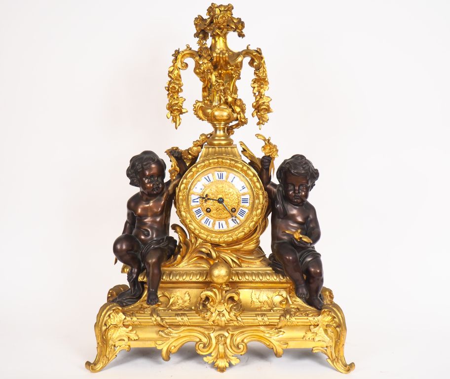 Superbe pendule de cheminée Napoléon III en bronze patiné et doré, à décor d'amours, de vase de fleurs, de feuillage et de globe terrestre. Mouvement signé Rollin à Paris, bronzes signés Crozatier. Etat exceptionnel, dorure parfaite. Dim. 79 x 56 x 24 cm