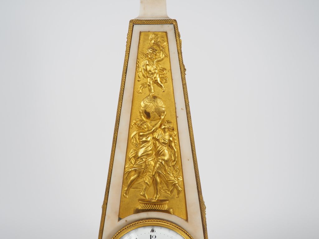 Superbe pendule fin XVIIIème début XIXème en forme d'obélisque en marbre blanc et bronze ciselé et doré, à décor de nymphes portant le monde, de Cupidon, de lions, de draperie, d'attributs guerriers et d'une sphère armillaire. Cadran émaillé signé Jacquot à Paris. La base en marbre noir. H. 75 x 32 x 19,5 cm