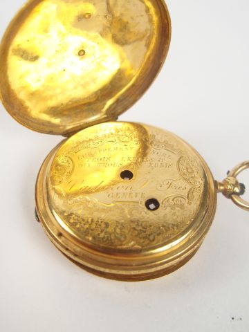 VACHERON CONSTANTIN. Montre de gousset en or jaune, échappement à ancre, 3 levées et 10 trous en rubis (manque lunette). Poids tel: 39,7 g