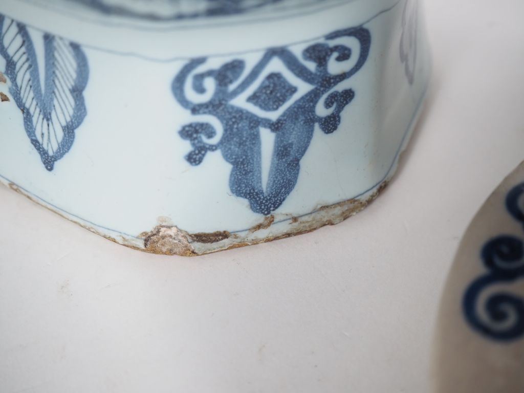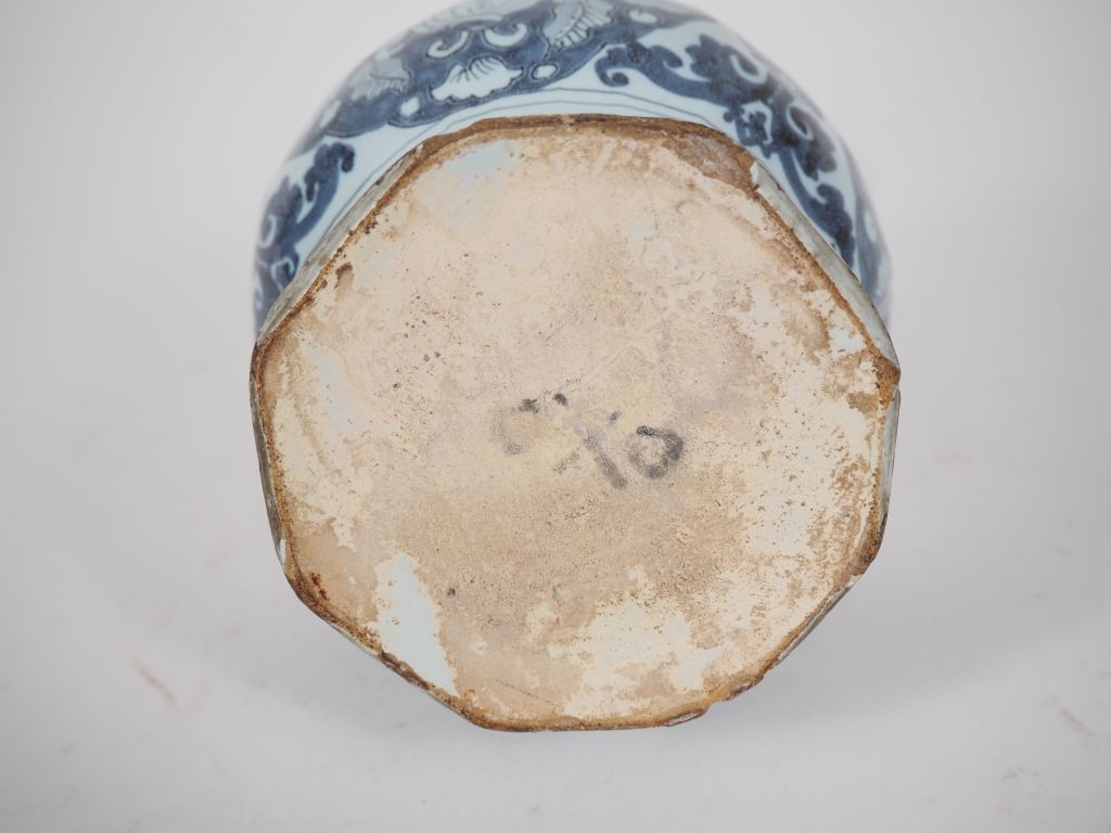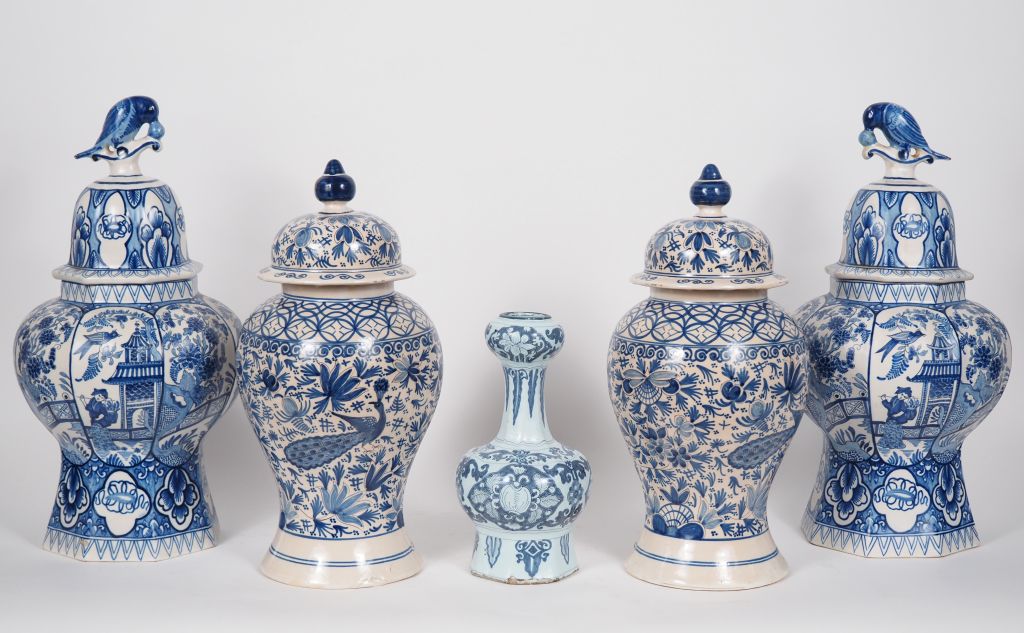 2 paires de potiches en faience de Delft. H. 39 cm et 46 cm (un cheveu à la base d'une des potiches, deux petites égrenures) un vase en camaieu bleu de style Extreme Orient. H. 24 cm
