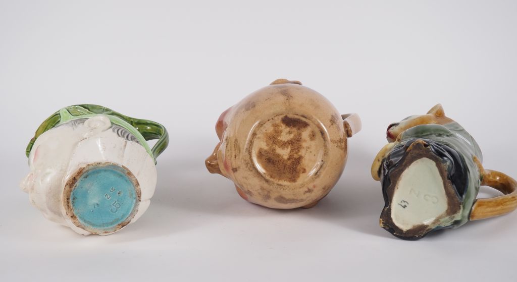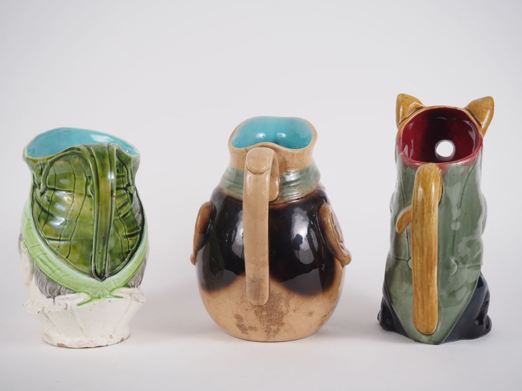 3 différents pichets anthropo - zoomorphes en céramique polychrome. (égrenure à l'un)