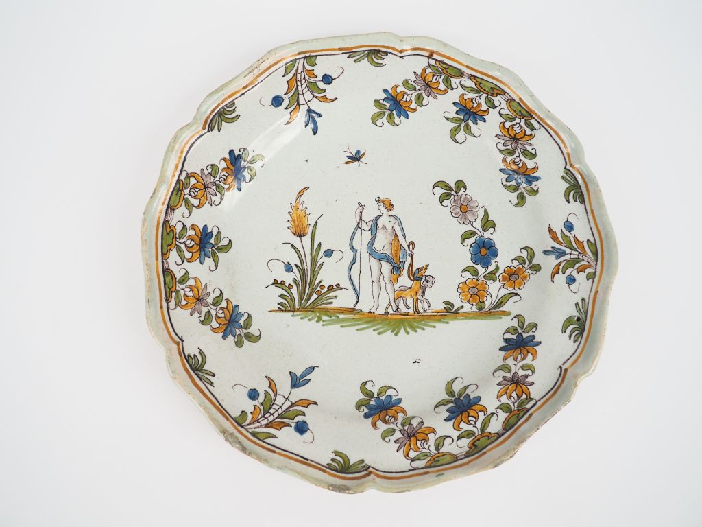 Assiette en faience du Sud de la France XVIIIème, à décor d'une représentation de Diane Chasseresse. Diam. 24 cm (restaurations)