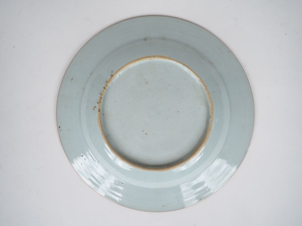 Assiette XIXème en porcelaine de style extrême-orient à décor en camaîeu de rose et bleu d'oiseaux branchés, de fleurs et de rinceaux. Diam. 22,5 cm. (Fel de cuisson).