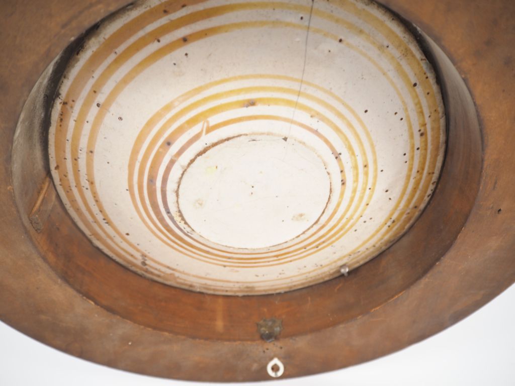 Assiette XVIème en faïence italienne lustrée à décor émaillé polychrome de motifs géométriques et orné en son centre d'un cœur transpercé. Dans un encadrement en bois postérieur. Diam. 21 cm. (Fel).
