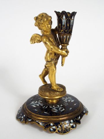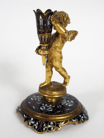 Bougeoir Napoléon III en bronze doré et émaux polychromes figurant un amour. H. : 14,5 cm