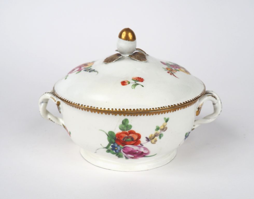 Bouillon XIXème en porcelaine à décor polychrome de bouquets de fleurs, prise en forme de gland et anses torsadées. Dim. 14 x 18,5 x 15 cm. (restauré)