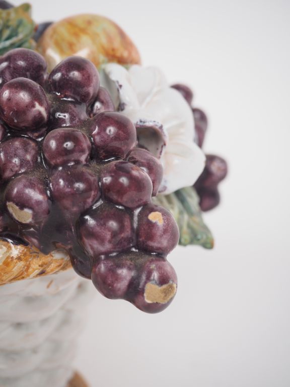 Centre de table en céramique polychrome en forme de corbeille de fruits. Dim. 23 x 33 x 29 cm. (égrenures)
