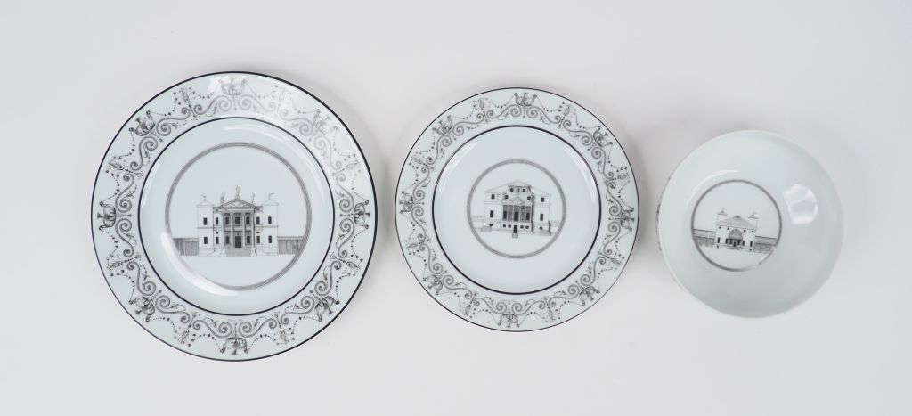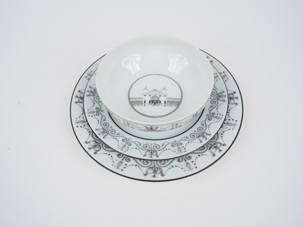 Christian DIOR. Partie de service de table en porcelaine de Limoges, modèle 'PALLADIO'. Comprenant : - 27 grandes assiettes - 24 petites assiettes - 12 ramequins