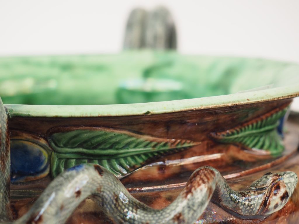 Coupe XIXème en barbotine polychrome à décor en relief de marscarons. anses en forme de serpents en relief. Dim: 17 x 33 cm. (petite égrenure sous le col).