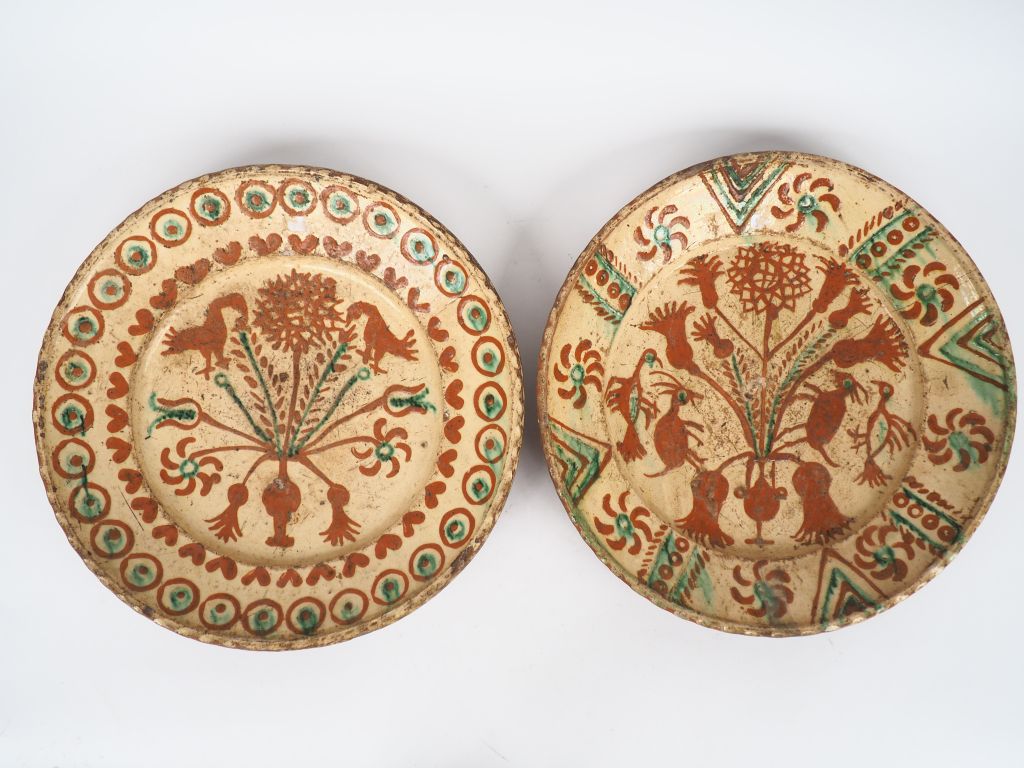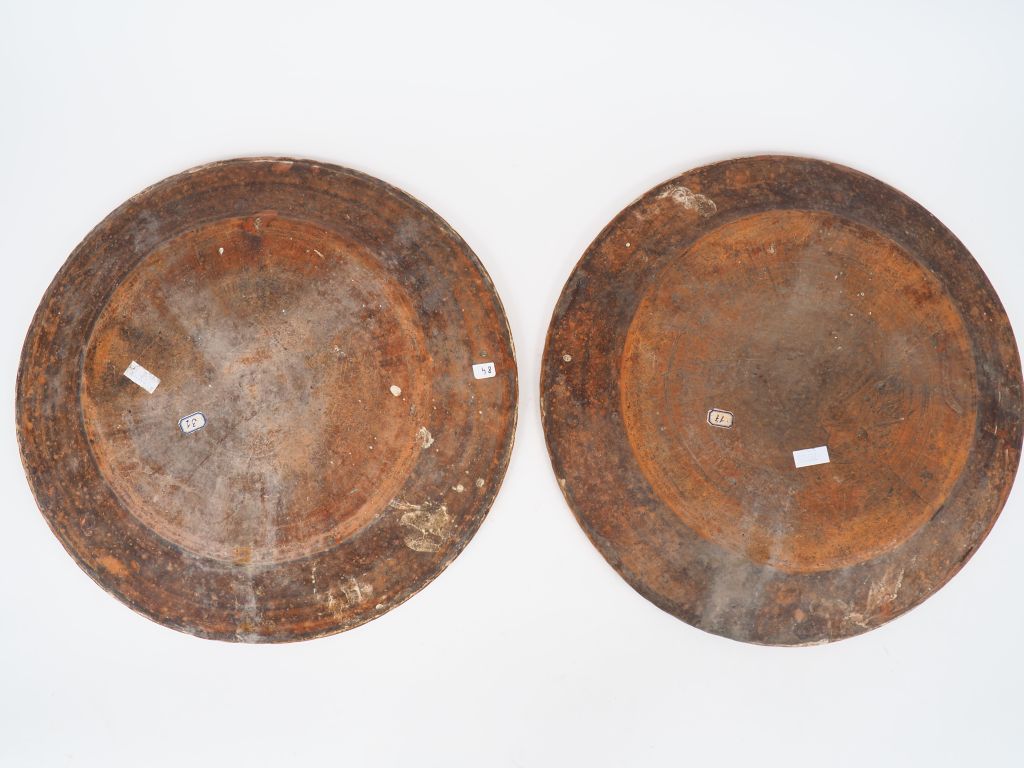 Deux plats en terre vernissée à décor d'oiseaux et de fleurs dans des tonalités brique rehaussé de vert sur fond jaune Diam. 38,5 cm (fel)