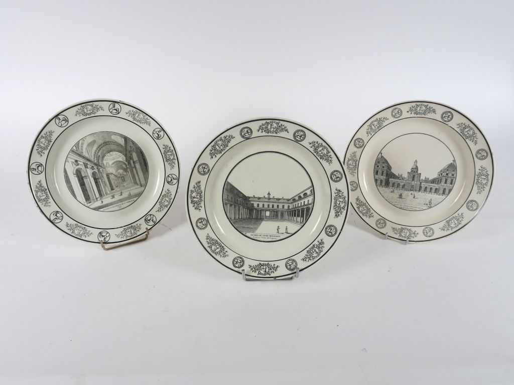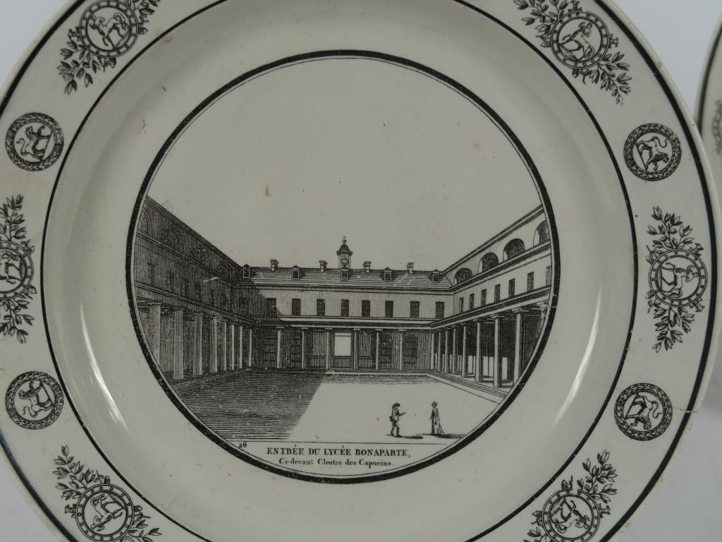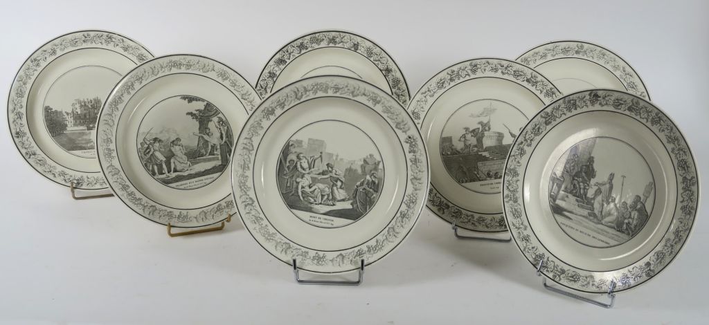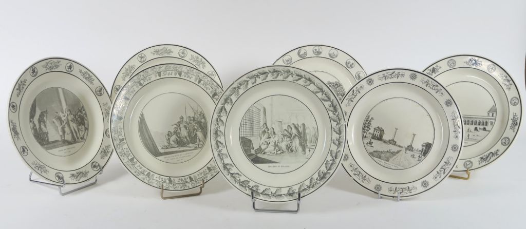 Dix-sept assiettes en faïence de Creil, à décor en grisaille. Modèles dépareillés. (quelques petits accidents)
