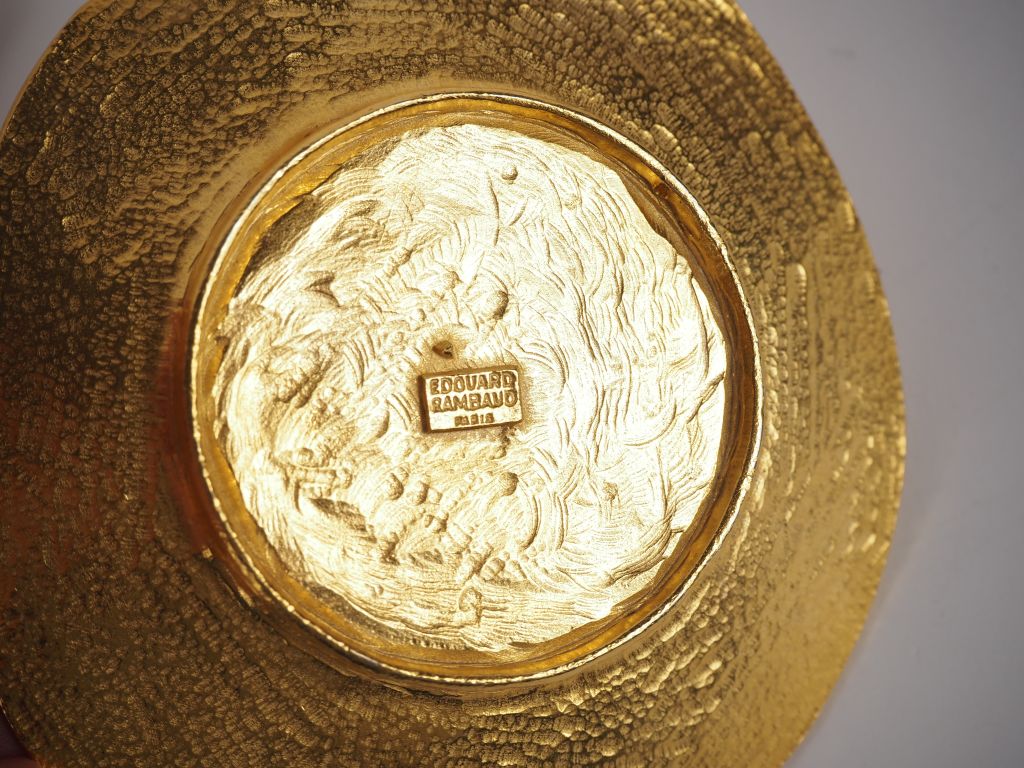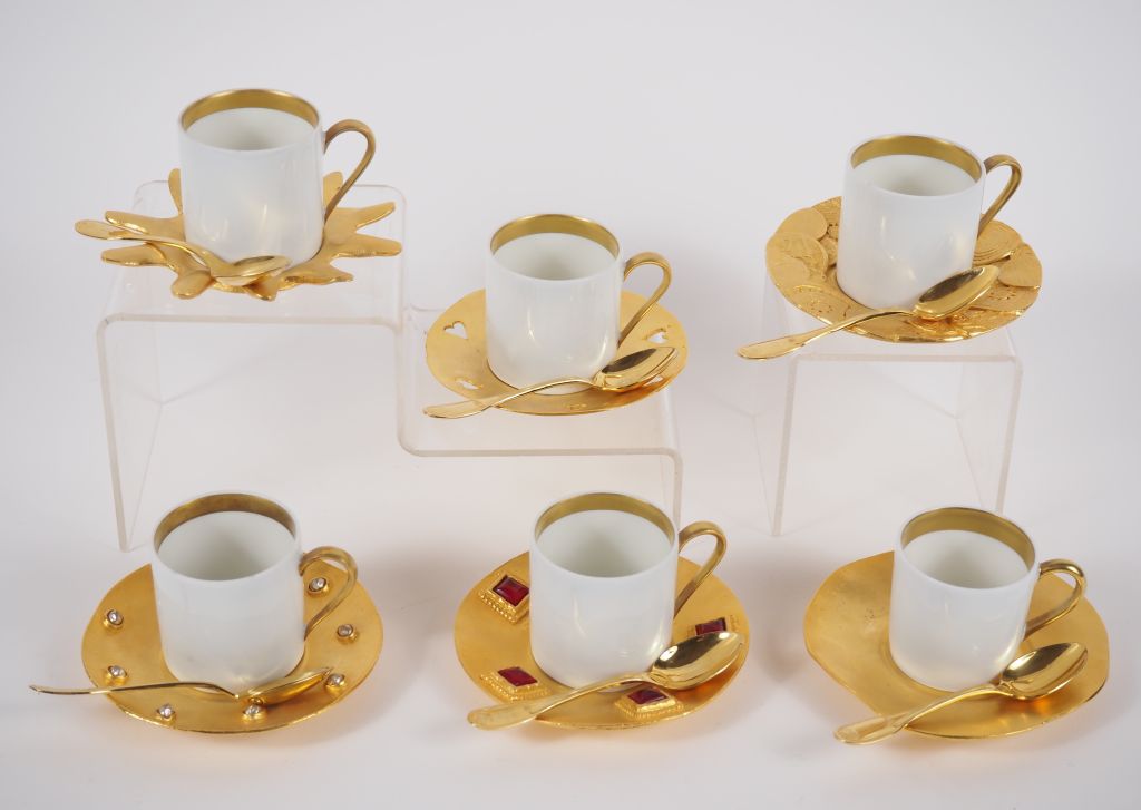 Edouard RAMBAUD. 6 tasses et sous tasses et cuillères en porcelaine et métal doré. Signées