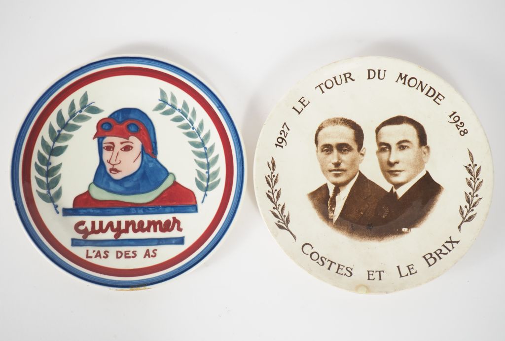 Ensemble de 2 assiettes commémoratives en Gien et Sarreguemines. "Guynemer l'As des As" "Costes et Le Brix 1927 1928 Le Tour du Monde" (petite restauration sur une assiette)