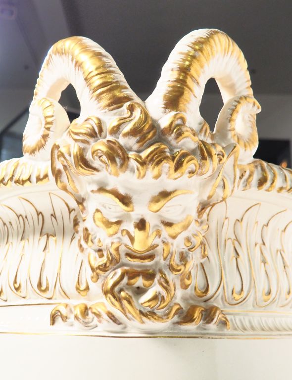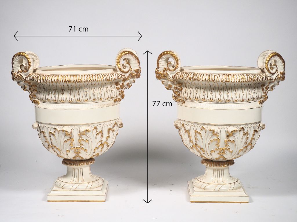 Exceptionnelle paire de vases en Sarreguemines, à décor de têtes de faunes, frise de feuillage et de cannelures, de couleur ivoire rehaussée d'or. H. 77 cm Largeur : 71 cm (parfait état)