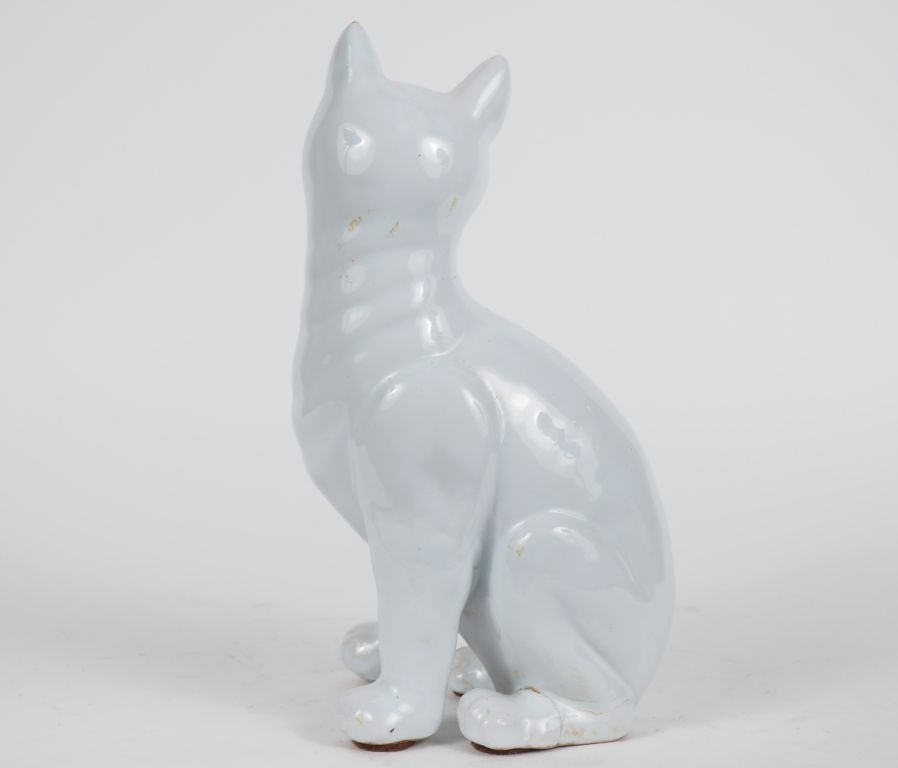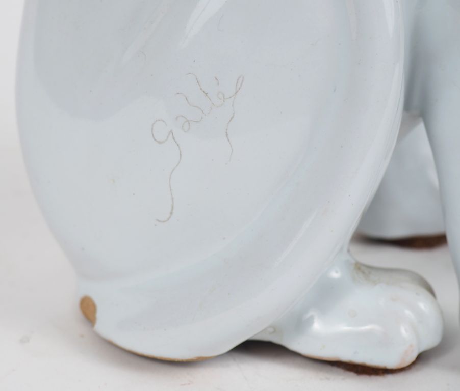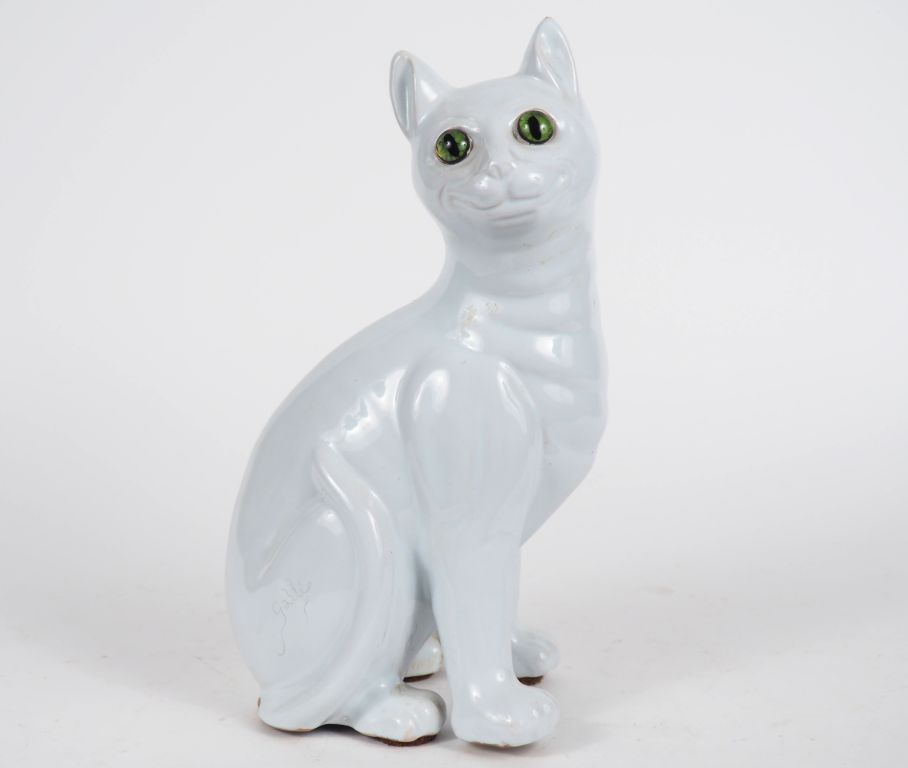 GALLE. Chat en faience blanche. Signé. (égrenure et une patte accidentée et recollée). H. 34 cm