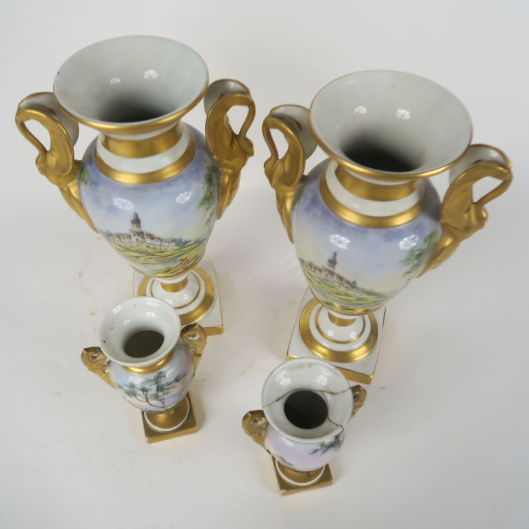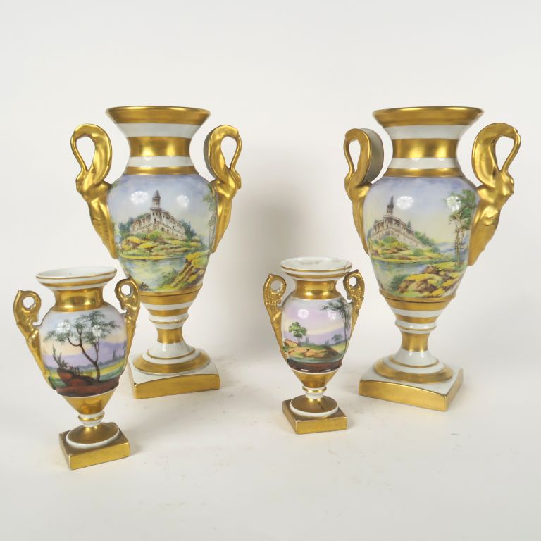 Garniture de cheminée Napoléon III en porcelaine de Paris à décor de paysages, comprenant deux différentes paires de vases. H. 33 cm. H. 17,5 cm. (fel sur un des petits vases)