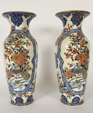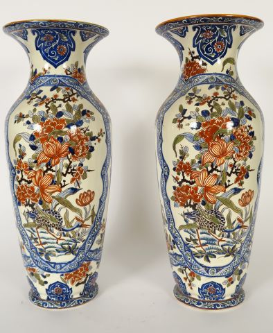 GIEN. Paire de grands vases en faience polychrome à décor d'oiseaux et de fleurs. H. : 46 cm